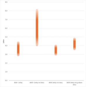 | Tage | BKW <1kWp | BKW <1kWp mit Akku | BKW 2kWp mit Akku | BKW 2kWp mit großem Akku | |