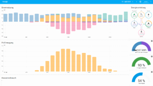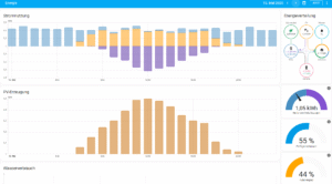 Speziell an Tagen, an denen ich nicht zuhause war, geht ein großer Teil des Ertrags ins Netz. Ich komme auf 55% Eigenverbrauch und einen Autarkiegrad von 44%.