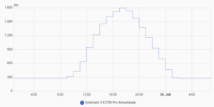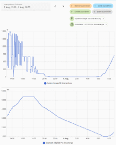 Deutlich zu sehen ist, dass mit geladenem Akku der Solarertrag auf 800 W gedrosselt wird, da der Wechselrichter mehr nicht abgeben darf. Jedoch komme ich mit der Akkuladung nicht durch die Nacht. Es wäre also mehr möglich.